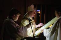 De paaskaars symboliseert daarmee het licht van Christus, die volgens de christelijke traditie het duister, het kwaad heeft overwonnen. Tijdens de Eucharistieviering ontvingen drie jongvolwassenen de sacramenten Doop, Vormsel en Eerste H. Communie.