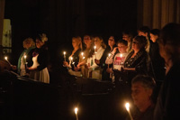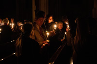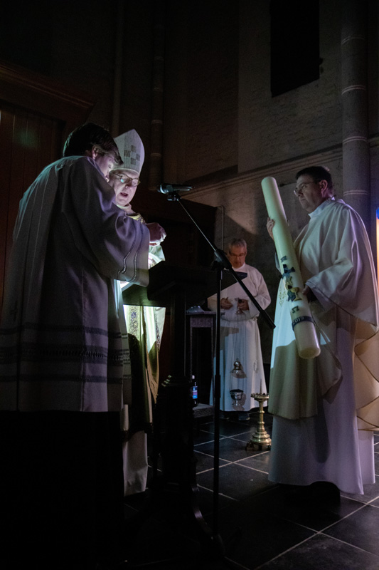 Een hele bijzondere ervaring: in een pikdonkere kathedraal een plaatsje vinden in afwachting van het licht. De Paaswake vangt aan in het portaal van de kerk alwaar de Paaskaars wordt voorzien van vijf ‘nagels’ van wierook en ontstoken. Langzaam dringt het licht door in de kerk als steeds meer mensen hun kaarsje aansteken aan de Paaskaars.